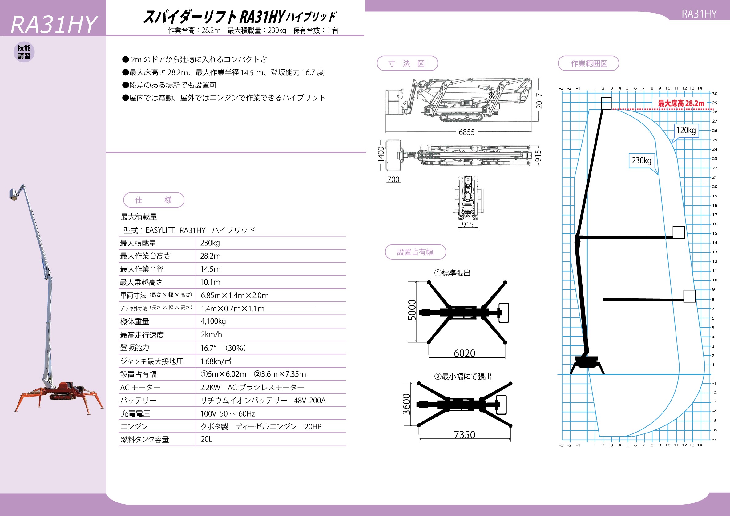 最大床高さは28.2mと30mに迫る高さ。 作業半径は最大で14.5mと、広い範囲で作業が可能です(120kg積載時)。